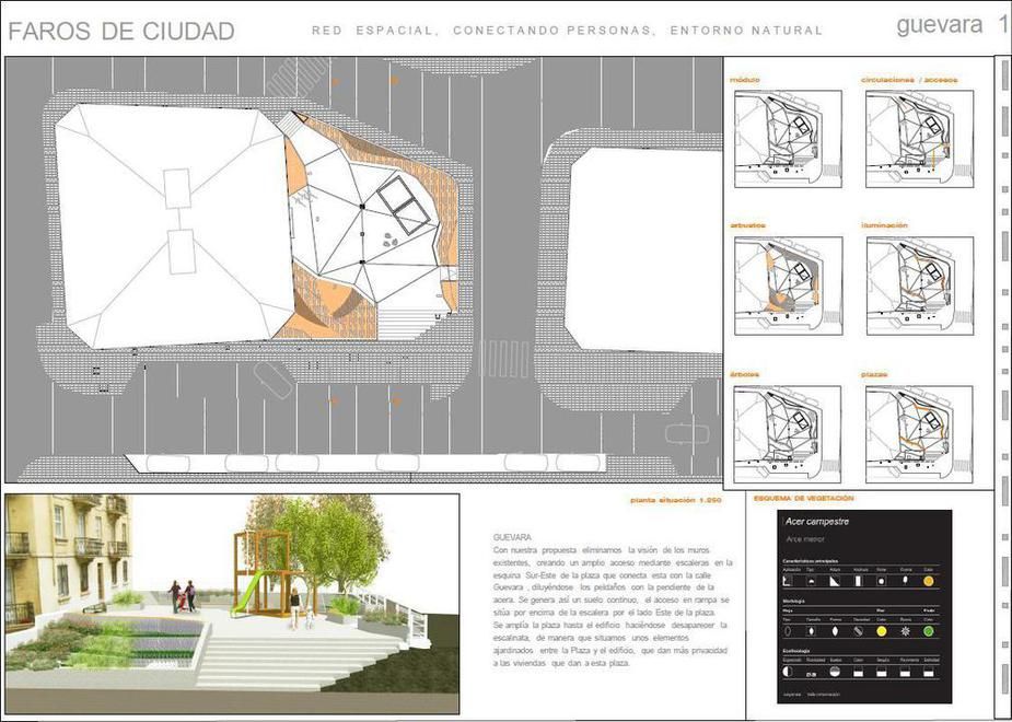 Con nuestra propuesta eliminamos la visión de los muros existentes, creando un amplio acceso mediante escaleras en la esquina Sur-Este de la plaza que conecta esta con la calle Guevara , diluyéndose los peldaños con la pendiente de la acera. Se genera así un suelo continuo, el acceso en rampa se sitúa por encima de la escalera por el lado Este de la plaza. Se amplía la plaza hasta el edificio haciéndose desaparecer la escalinata, de manera que situamos unos elementos ajardinados entre la Plaza y el edificio, que dan más privacidad a las viviendas que dan a esta plaza.