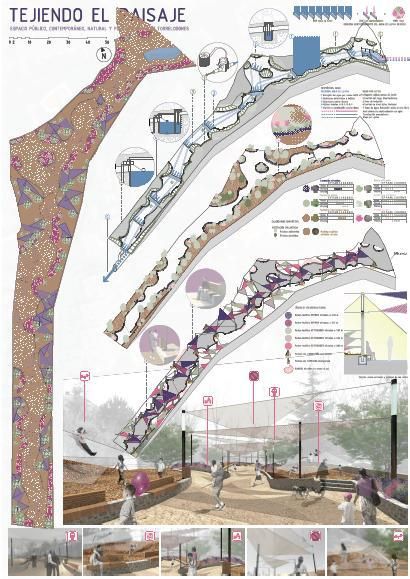 ¨TEJIENDO EL PAISAJE¨ por medio de INTERVENCIONES SENCILLAS CEÑIDAS AL PRESUPUESTO, como lo son estas estructuras de tejidos con aristas rectas y trianguladas, se crea un ESPACIO PÚBLICO CONTEMPORÁNEO, NATURAL Y PLURISENSORIAL, a lo que se suma una gran conciencia en relación a la SOSTENIBILIDAD, fundamentando la propuesta en el uso eficiente del agua, tanto en lo que concierne a su gestión como a la elección de la vegetación implantada.